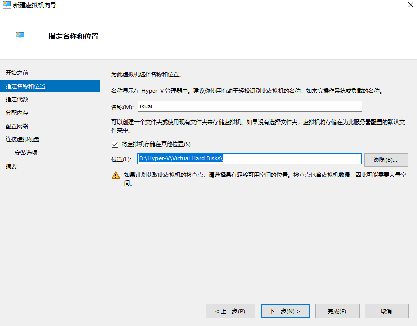 虚拟硬盘文件默认位置:D:\Hyper-V\Virtual Hard Disks 虚拟机配置文件默认位置:D:\Hyper-V 一开始是没有对应目录的 需要提前手动创建下一步后确认 勾选然后点击安装即可,机器会自动重启 重启后就安装成功了