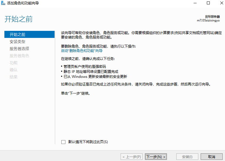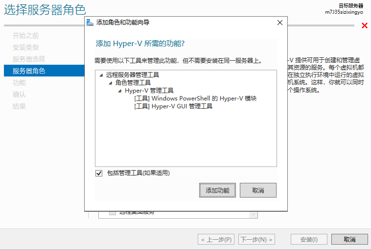 之后连续两个页面默认下一步,到了服务器角色这步选择Hyper-V