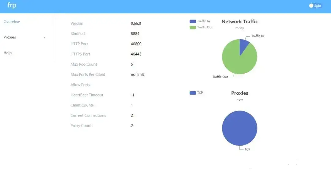 Frps服务端部署完成后,即可通过浏览器访问监控页面: