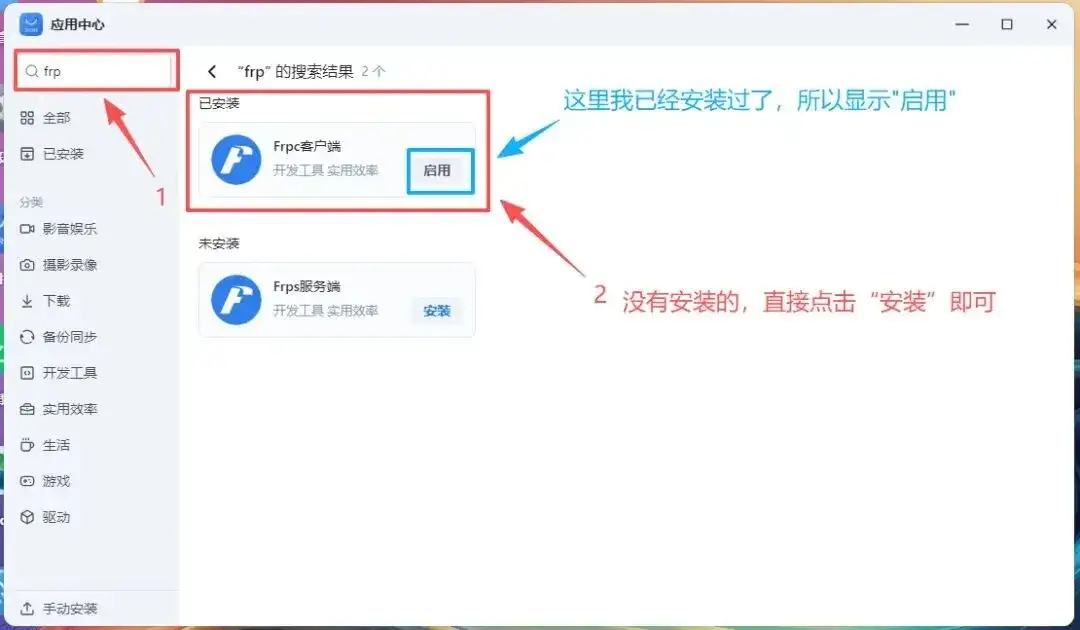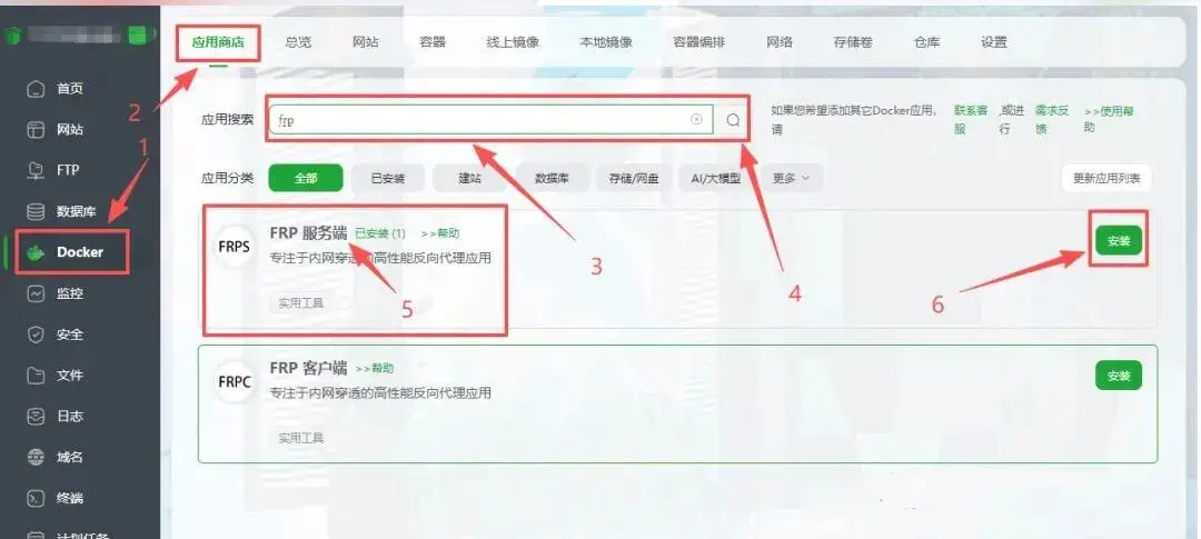 在搜索框中输入 “frp”,在结果中找到 “FRP服务端:FRPS”,点击安装。