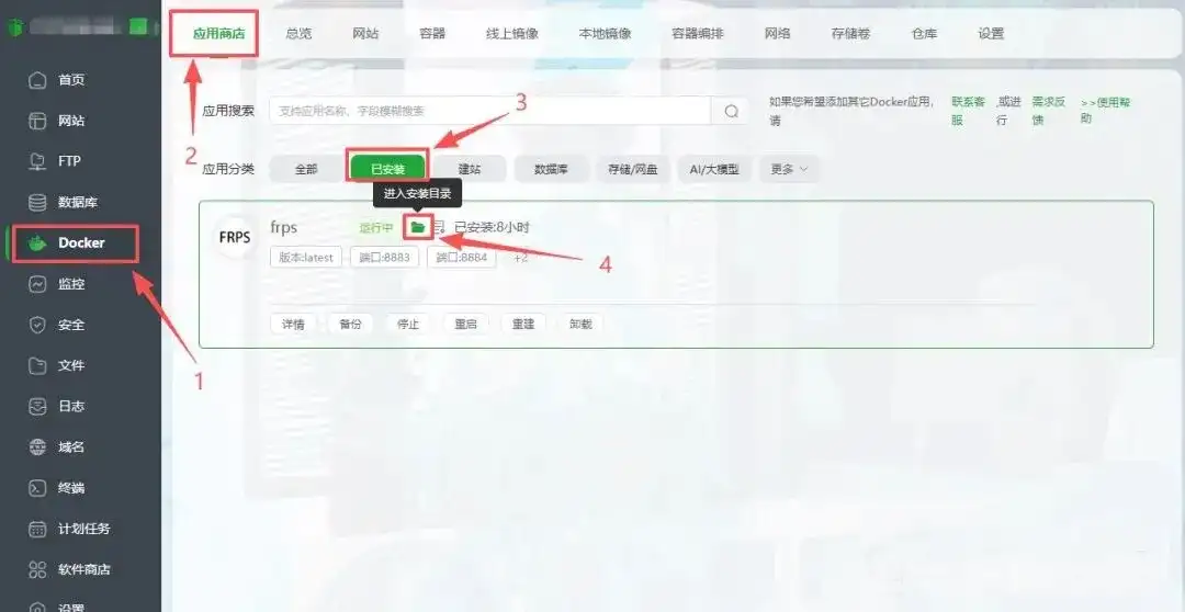 进入宝塔面板的 “Docker” → “应用商店” → “已安装”,找到FRPS项,点击 “进入安装目录” 图标。