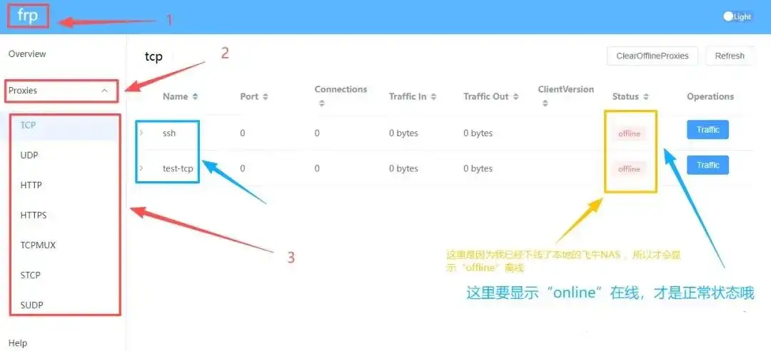 配置提交后,再次通过浏览器访问Frps监控页面(http://服务器IP:7500),登录后查看 “Proxies” 列表。若看到你添加的隧道(如fnas-web、ssh)显示为 active 状态,即表示内网穿透已成功建立。
