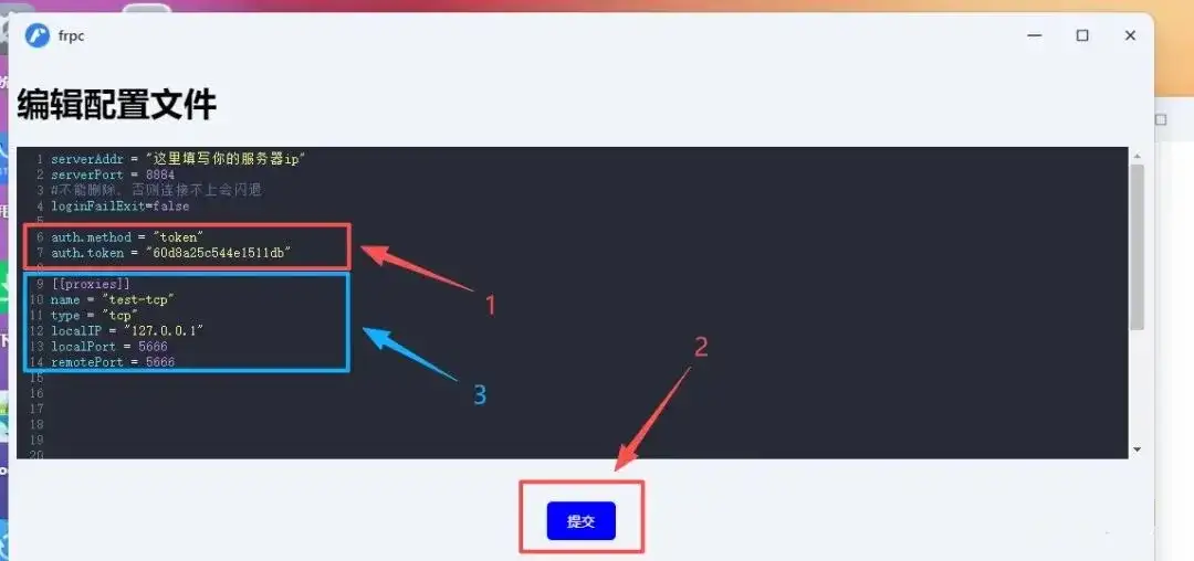 在编辑配置页面,将刚才复制的 auth.token 值(不含引号)填入配置中对应位置(通常在第6-7行),点击 “提交”。