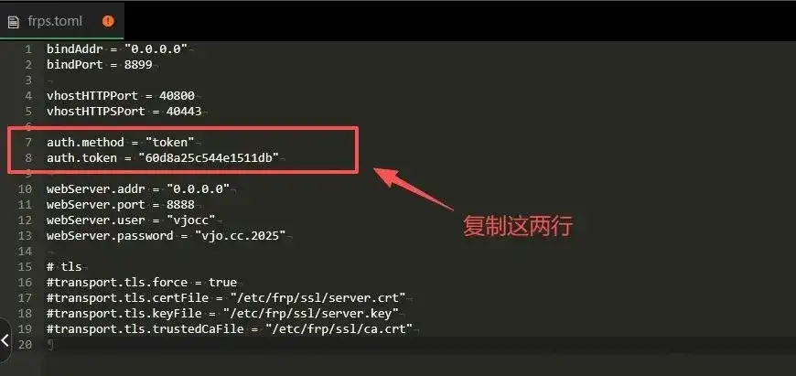 进入目录后,打开 data 文件夹下的 frps.toml 文件,复制其中 auth.token 后面的密钥字符串(例如 "60d8a25c544e1511db")。