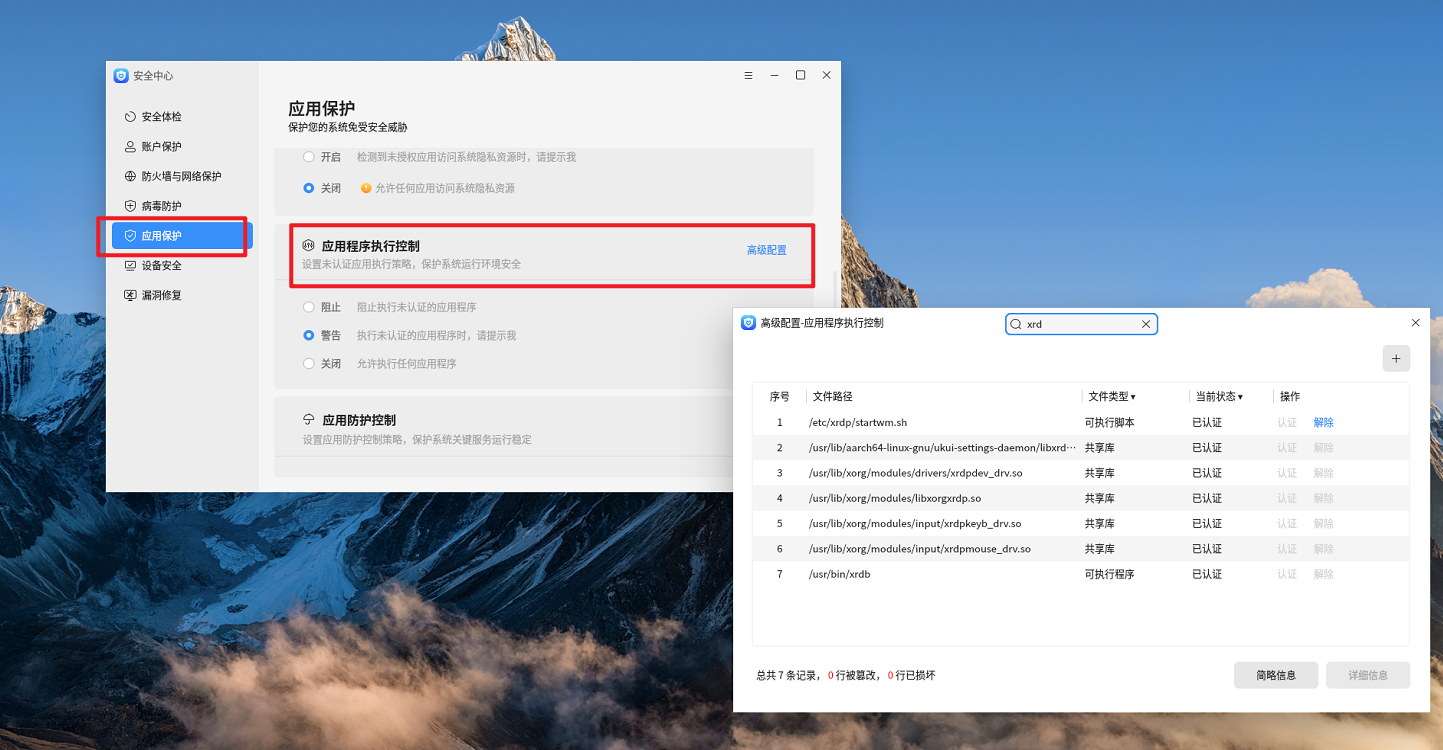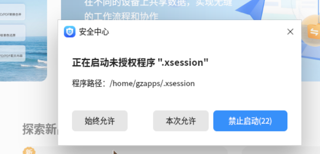首次使用xrdp远程登录时,kylin V10的安全中心会弹出是否授权程序startwm.sh与当前用户下.xsession运行的提示,点击始终允许就可以了,如下图